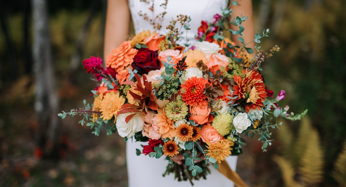 A frosty bouquet of white roses, snowberries, and icy blue accents.